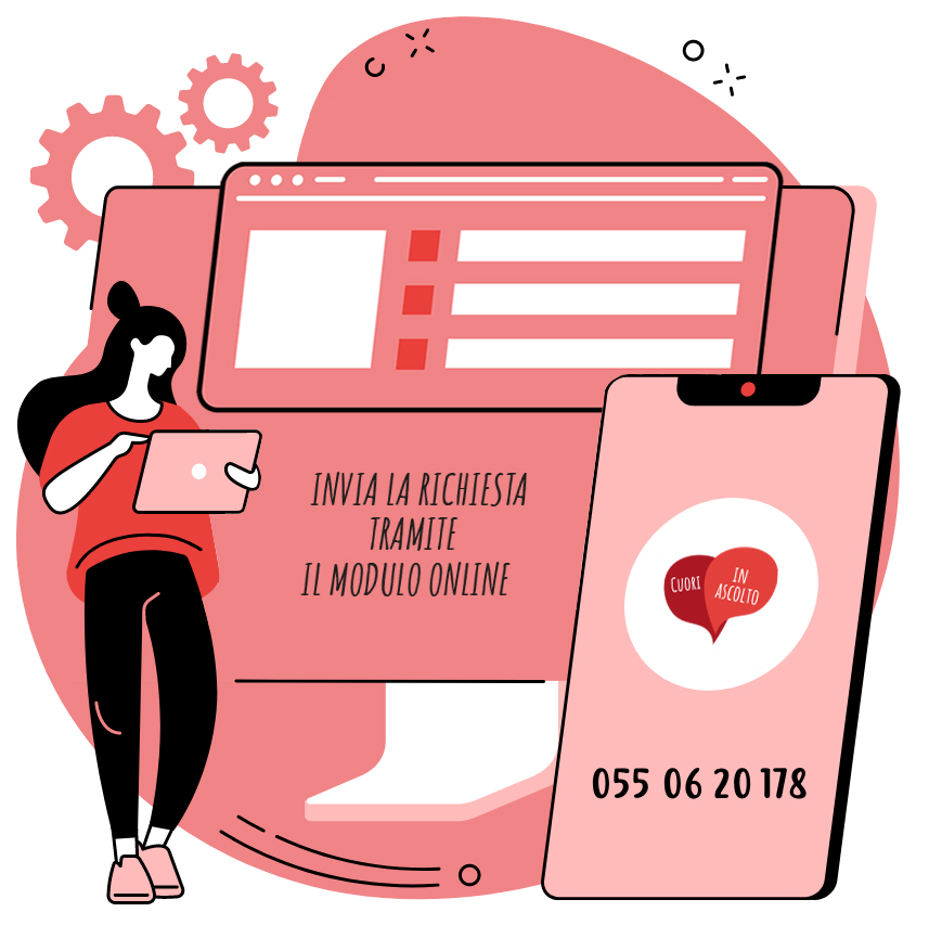 Cuori in Ascolto ha due modalità di contatto: telefonico, chiamando il numero 055 06 20 178 oppure online compilando il modulo che trovi alla fine di questa pagina, in basso a destra, in questo secondo caso ti basterà inserire le tue informazioni e il motivo della richiesta che verrà presa in carico da un volontario che ti ricontatterà al più presto.
